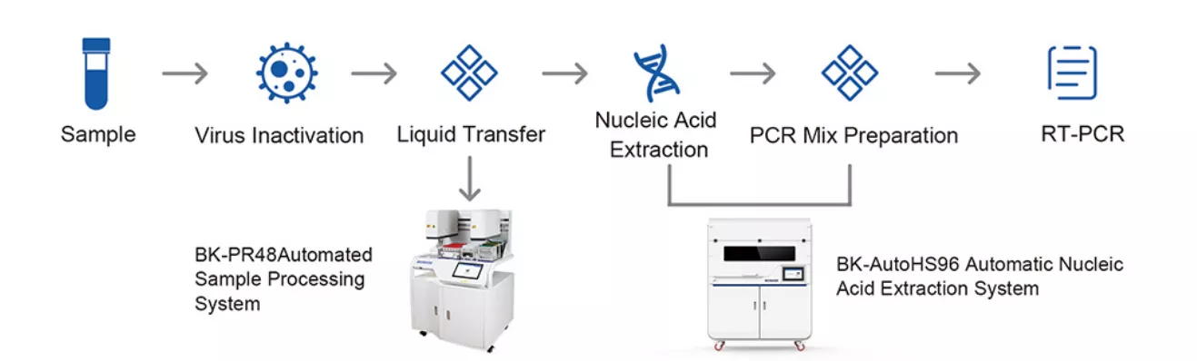 It can complete lid openinglclosing, dispensing, proteinase K/internal control addition, which helps laboratories quickly improve their large-scale nucleic acid detection capabilties.